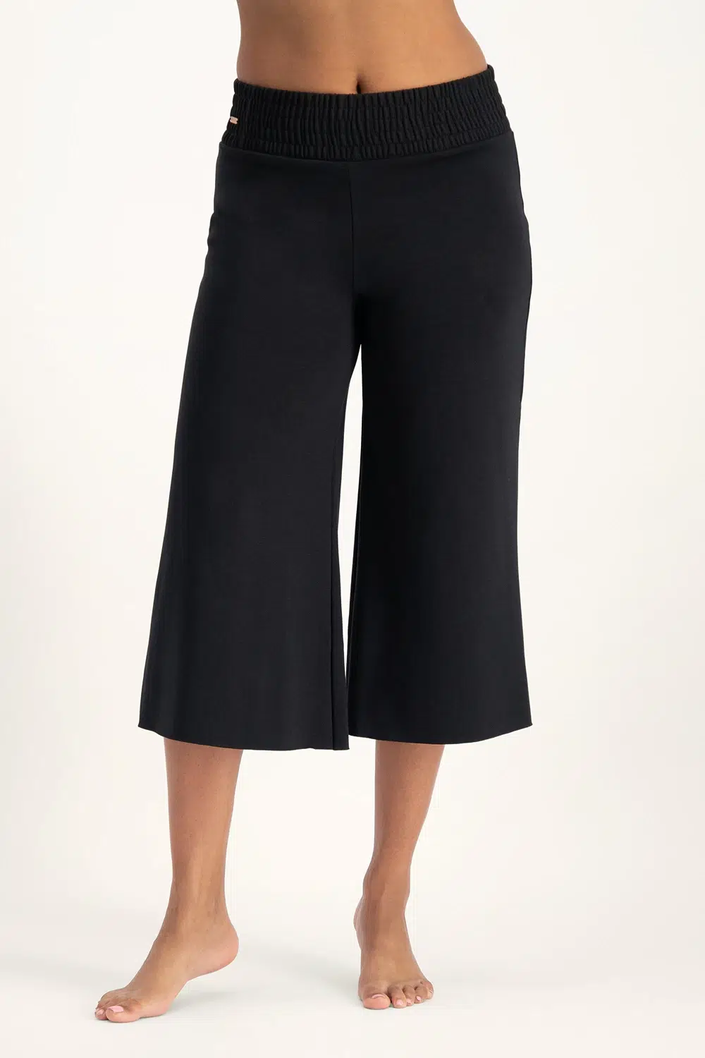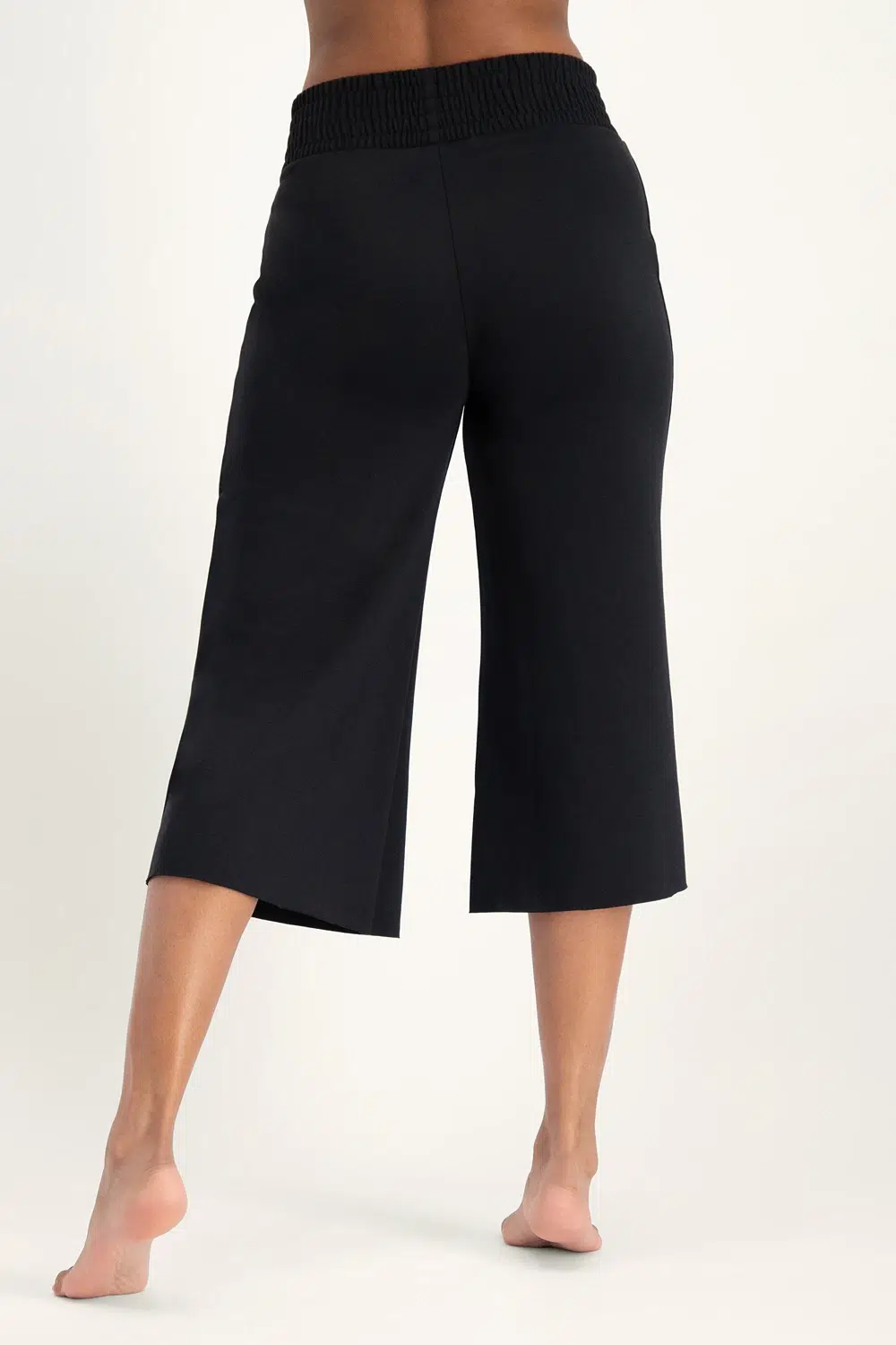 These fine wide capri yoga pants are made from a luxurious blend of lyocell and organic cotton. And give you the perfect combination of stretch, softness and breathability. The smock waistband ensures a comfortable fit that stays in place, no matter what you do. With the shorter length and the wide legs, these capri pants are ideal for calm yoga styles such as yin, hatha, restorative and meditation.