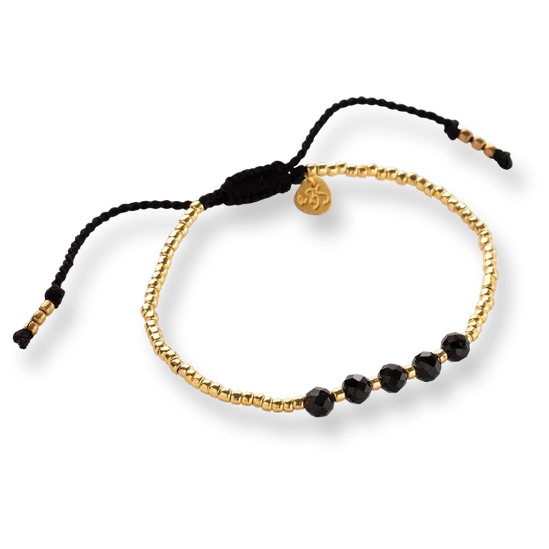 De armband is verstelbaar dankzij een handige schuifknoop, waardoor hij perfect om elke pols past. Met glinsterende glazen goudkleurige kralen en 5 geslepen zwarte onyx edelstenen is deze a Beautiful Story armband ideaal voor elke gelegenheid.