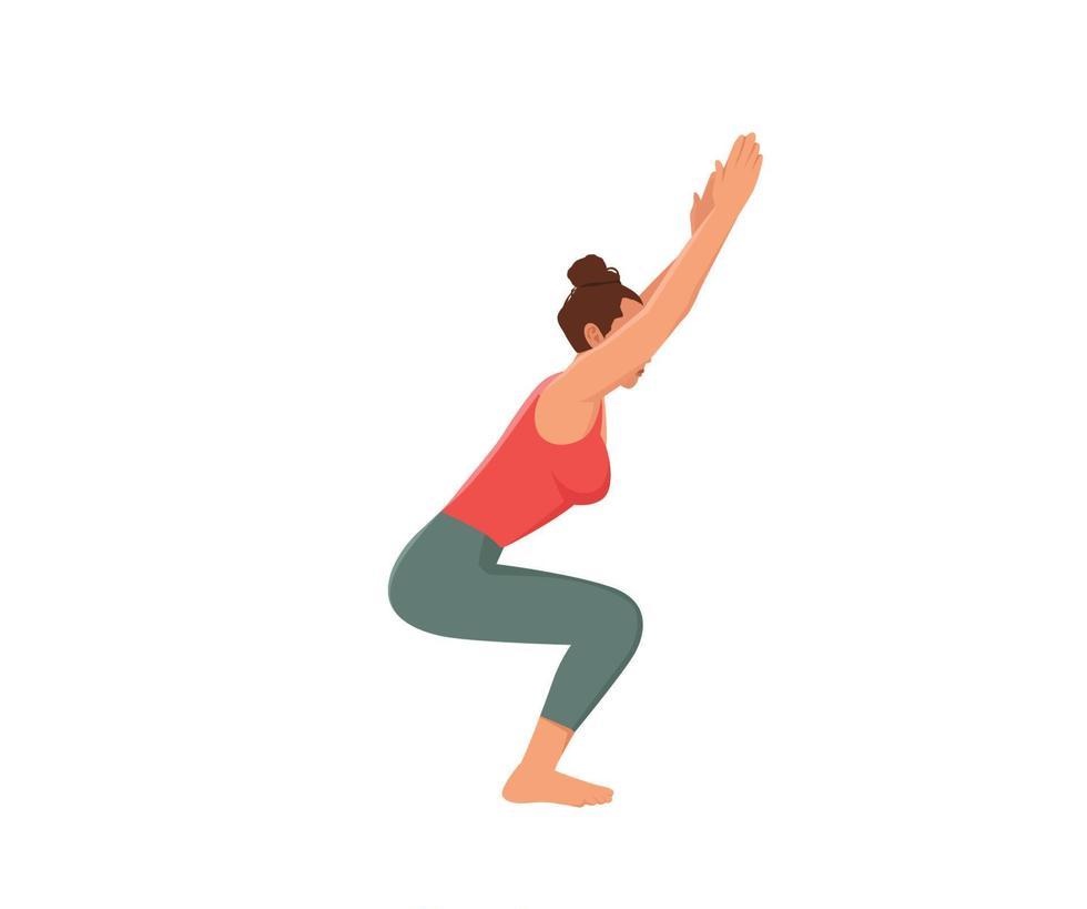 We beginnen met de favoriete houding (ahum) van veel yogastudenten: Stoelhouding. Soms lijkt het alsof de yogadocent het expres doet, ons zo lang in die houding laten staan. Maar het heeft een goede reden. Sneller opwarmen met een houding kan bijna niet! Het versterkt de benen, de enkels, de buikspieren, de onderrug en het strekt de schouders.