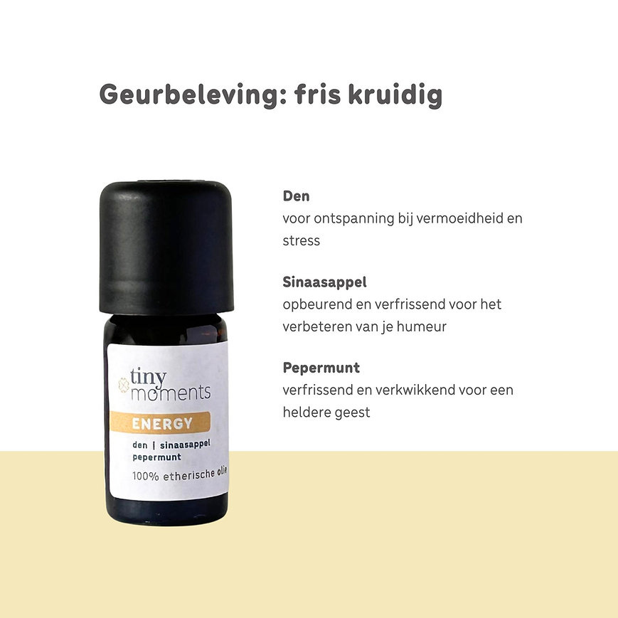 Boost je energie met de Tiny Moments Etherische Olie Energy. Deze pure geurolie met grove den, sinaasappel en pepermunt, vult je ruimte met een verfrissend en stimulerend aroma dat perfect is voor momenten waarop je behoefte hebt aan wat meer energie.