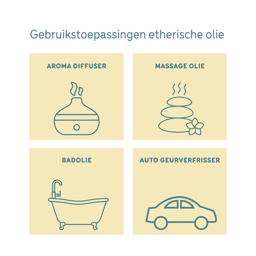 - Massageolie: etherische olie wordt ook gebruikt als massageolie. Ook hiervoor meng je eerst een paar druppels geurolie met een neutrale draagolie, want de etherische olie is te geconcentreerd om direct op de huid te gebruiken.