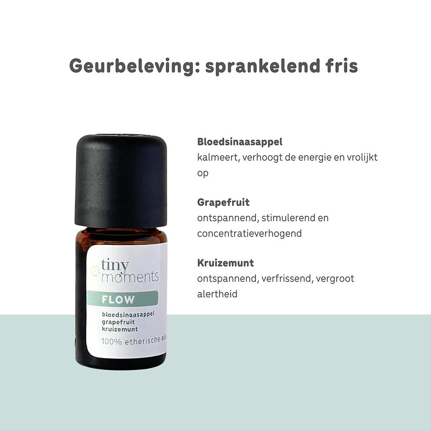 Boost je helderheid en energie met de Tiny Moments Etherische Olie Flow. Deze pure geurolie bevat een krachtige blend van bloedsinaasappel, grapefruit en munt, speciaal samengesteld om je mentale scherpte te vergroten en je energie een boost te geven.