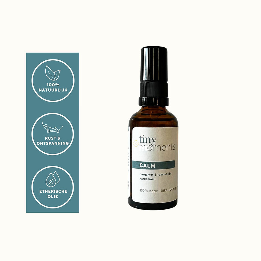 Voel je soms spanning, nervositeit of stress? Of heb je simpelweg behoefte aan een moment van pure ontspanning? Ontdek de kracht van de Tiny Moments Roomspray Calm, speciaal samengesteld om je een rustgevend momentje voor jezelf te bieden. Of je nu na een drukke werkdag wilt ontspannen of simpelweg een moment van stilte en kalmte zoekt, deze roomspray helpt je om spanning en stress los te laten. Dankzij de effectieve blend van bergamot, rozemarijn en kardemom creëer je een serene omgeving die je helpt je gedachten te kalmeren en innerlijke balans te vinden.