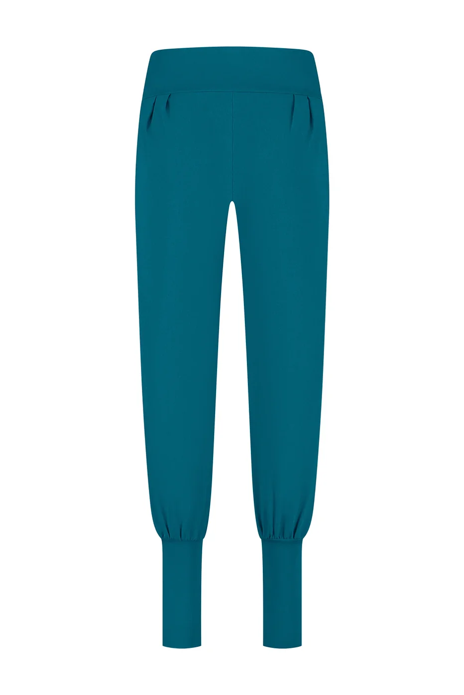 Deze hippe yoga broek heeft een fijne heupband die mid-waist valt. De heupband zorgt voor extra support en warmte rond de buik en onderrug. Aan de zijkanten van deze heupband vind je schattige plooien, die de zachte yoga harembroek wat extra flair geven. De losse pijpen van de Dakini yoga pants komen samen in slanke enkelcuffs, waardoor je pilates broek goed blijft zitten in elke houding.